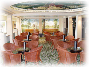 I ena delen av rummet porlar ett konstgjort vattenfall.